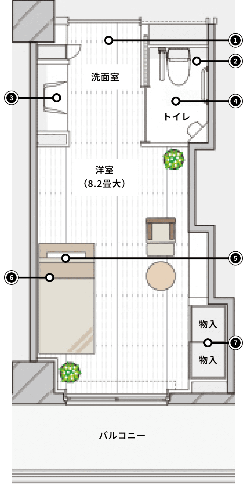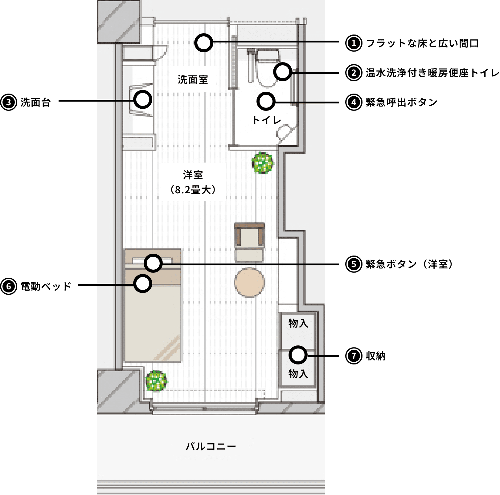 安心・安全にお過ごしいただけるよう設備や家具にこまやかな配慮をいたしました。住居内の数ヶ所に設置された緊急呼出ボタン、365日・24時間のスタッフ体制で、万が一のときも速やかに駆けつけます。
