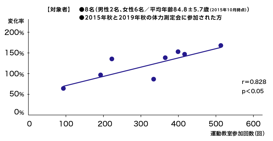 平均年齢約85歳の入居者の方々を対象にした調査で、運動教室への参加回数が多いほど、4年後の下肢筋力が向上していることが証明されました。90歳近くになっても、筋力を鍛え、動けるからだづくりに取り組まれています。(※縦軸の100%は2015年の下肢筋力を示す。)1年間に100回、おおよそ週2日の頻度で運動教室に参加された方々では、4年前よりも50%以上の筋力向上が認められた方がいます。