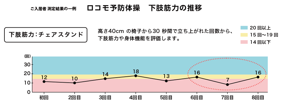 上の図は、あるご入居者の下肢筋力の測定結果です。一度入院され、一時下肢筋力の数値が低下されましたが、長年ロコモ予防運動プログラムを継続して取り組まれていたため、8回目の測定時には入院前と同程度に数値が回復されました。