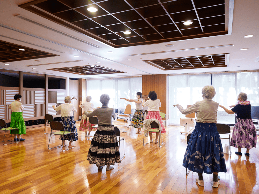 「グランクレール青葉台二丁目」では、月に1回「フラダンス」が行われています。ご自身でご用意いただいた衣装や首飾りを身に着けて、心地よいハワイアン・ミュージックに包まれながら、愉しまれている姿が印象的です。