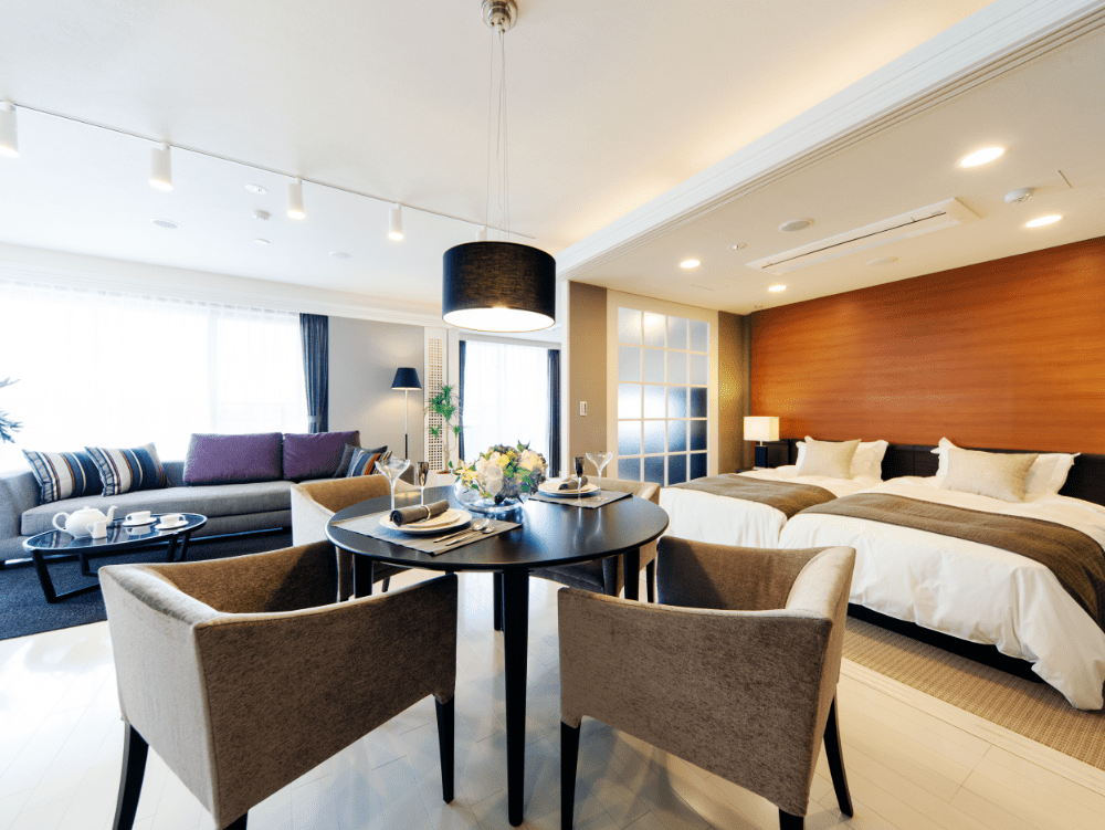 お部屋のキッチンで料理を作ることもできますし、お部屋にいながらお食事を愉しめるルームサービスも行っております。