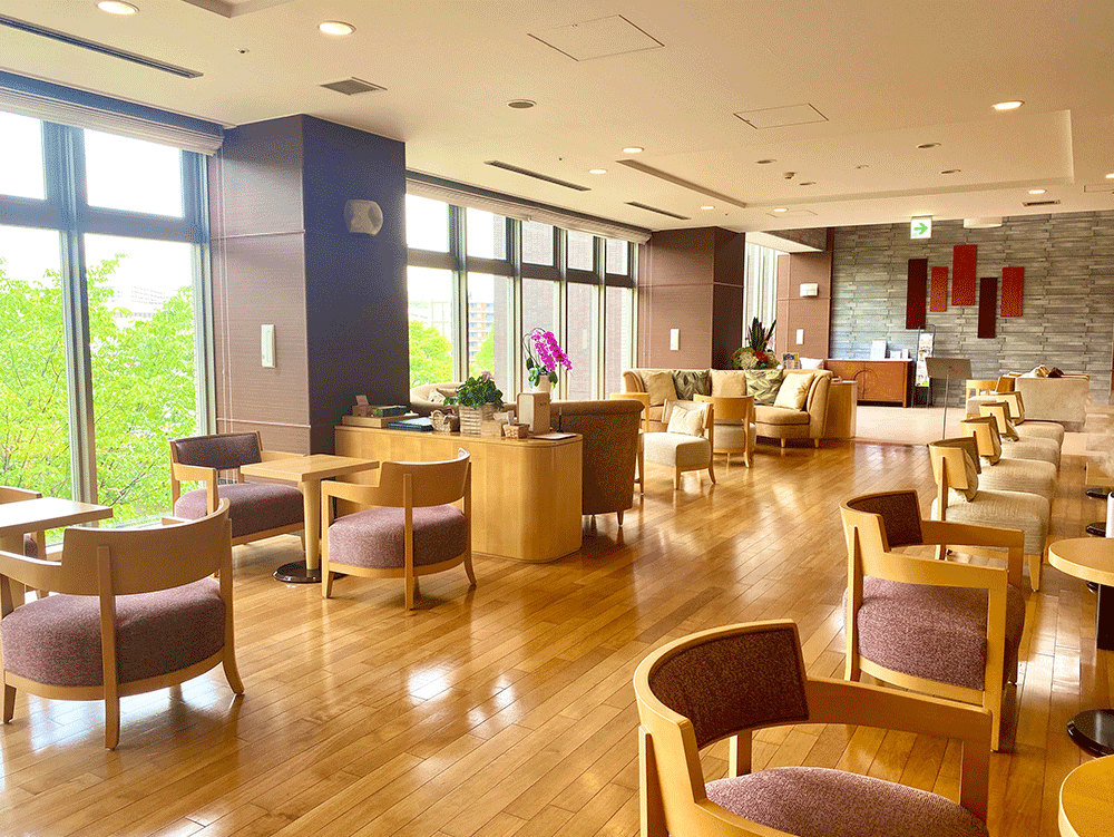 ティーラウンジでは、コーヒー、紅茶などのフリードリンクサービスをご利用いただけます。美しい庭園を眺めながら様々な時間を優雅にお過ごしいただけます。