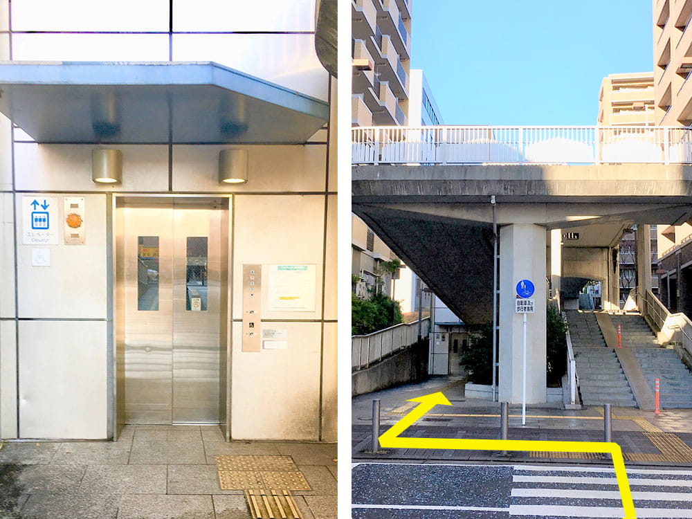 歩道橋(みらい歩道橋)の下、左側にエレベーターがあります。エレベーターで3階へ上がります。 ![]()  5