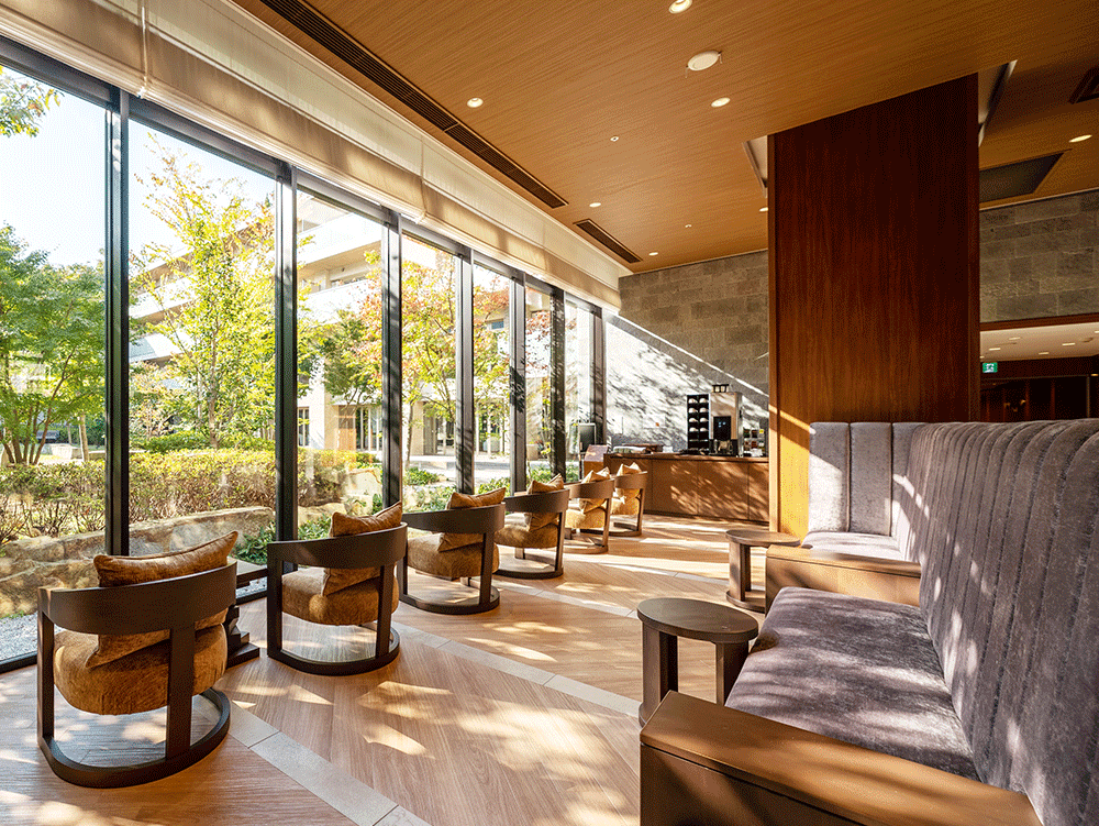 ティーラウンジでは、コーヒー、紅茶などのフリードリンクサービスをご利用いただけます。美しい庭園を眺めながら優雅な時間をお過ごしいただけます。