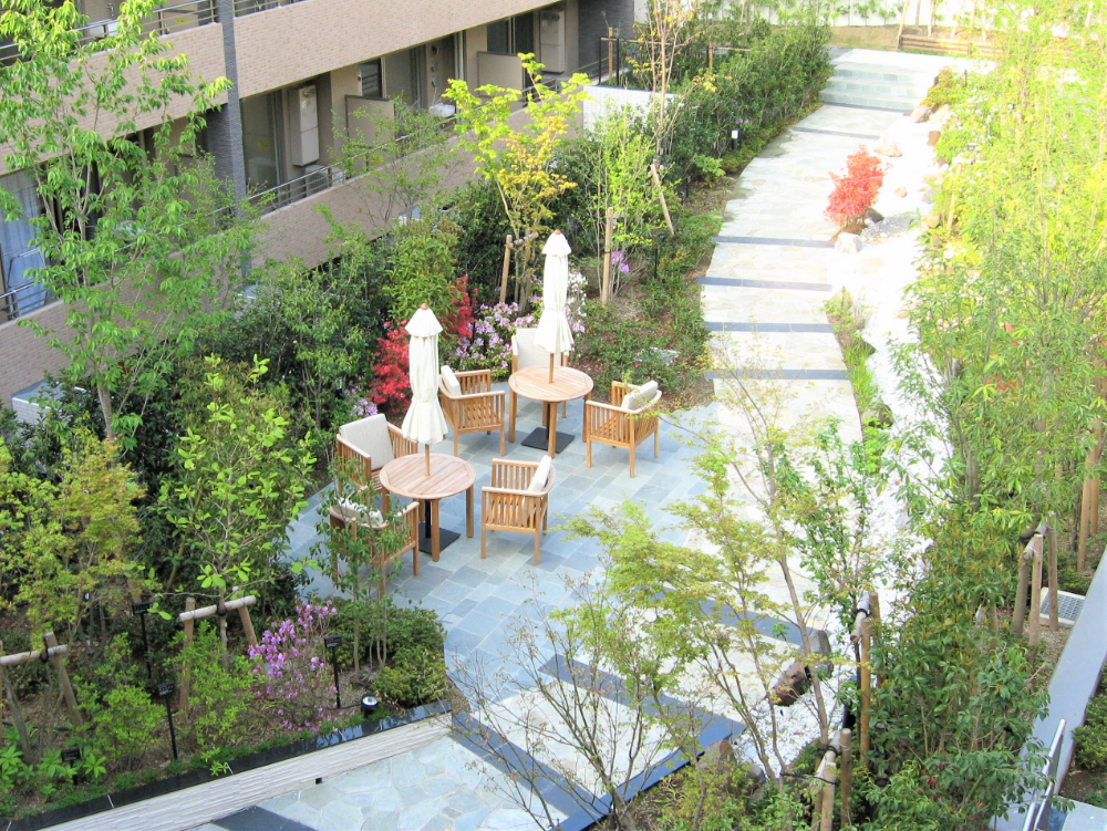 ゆったりとした時間を広々とした中庭では季節の花や草木を愉しむことができ、毎日のお散歩にも最適です。